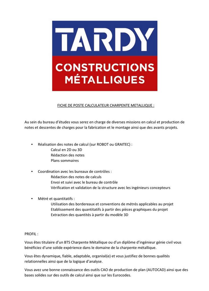 TARDY CONSTRUCTIONS METALLIQUES recrute un Technico-commercial en charpente métallique.